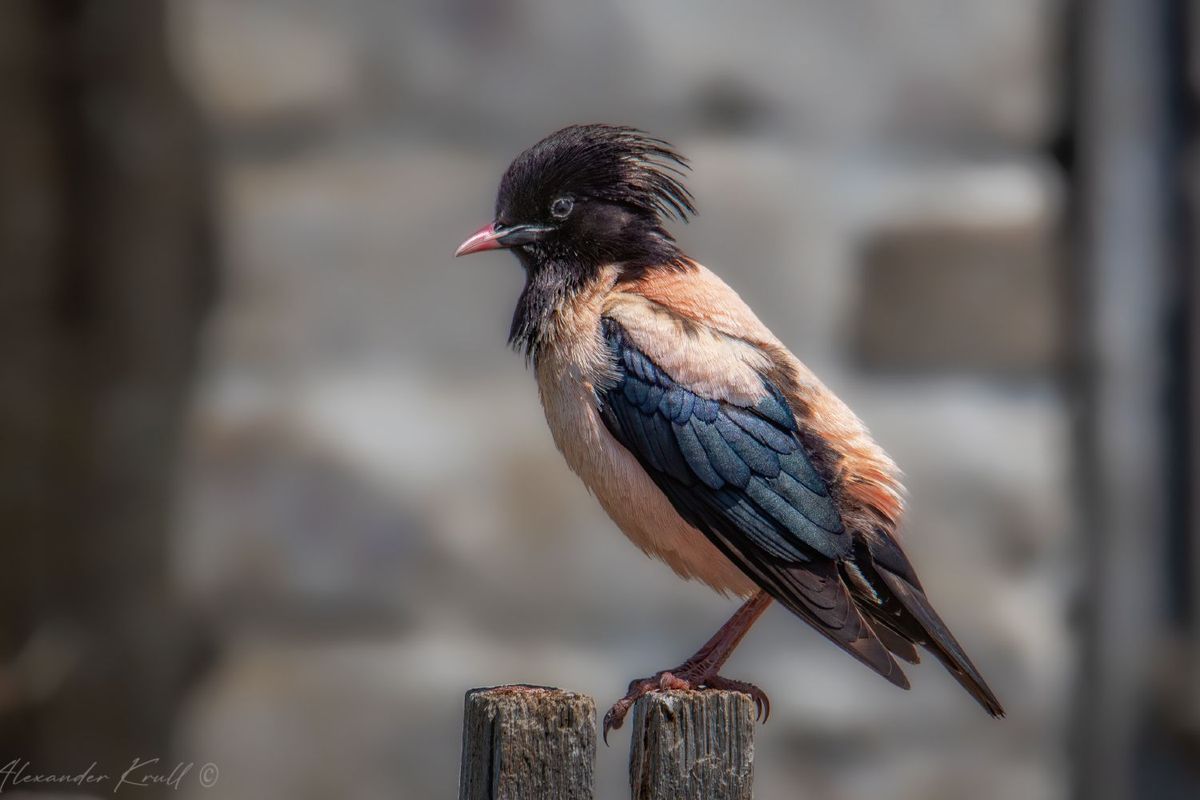 Один из представителей большой колонии розовых скворцов на старой ферме в степях Калмыкии.